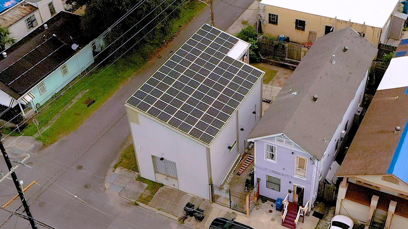 Aerial view of Ben’s glass blowing shop, covered with solar panels