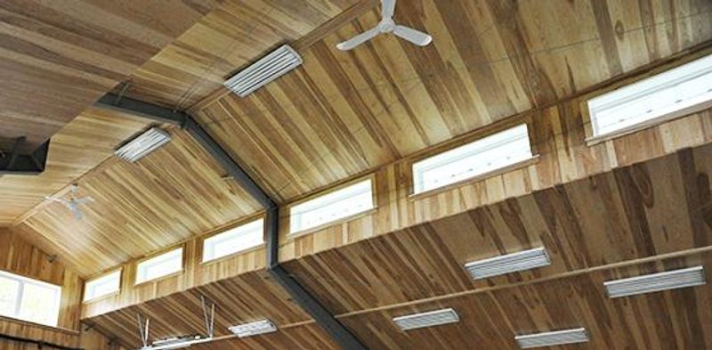 The snow and wind load requirements are already high in Maine. When you add the weight of the exterior oak and the interior Ash, the load calculations became complex. Not to mention, aesthetically, the rigid frame couldn’t be intrusive so as to detract from the paneling, and the whole point of choosing a monitor style building, for Derek, was the clear span interior ceilings and the unobstructed natural light this style allows.